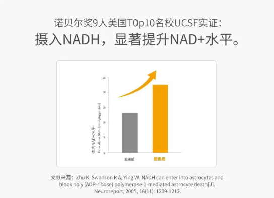 其次,NADH摄入体内后,除了产生NAD+,还分解一个特种生物氢"H+"。生物氢“H+”的强大之处在于:为免疫细胞等提供强大能量,增强代谢活性与超氧化物的转化能力;修复免疫细胞氧化应激所引起的炎症反应及损伤,增强吞噬细胞的杀伤能力,全方位激活免疫系统。NAD+与生物氢"H+"的协同作用下,使NADH发挥出综合抗衰作用,如超强抗氧化,改善睡眠,延缓衰老等,最终,做到1粒NADH的抗衰功能等同于4粒NMN的效果。